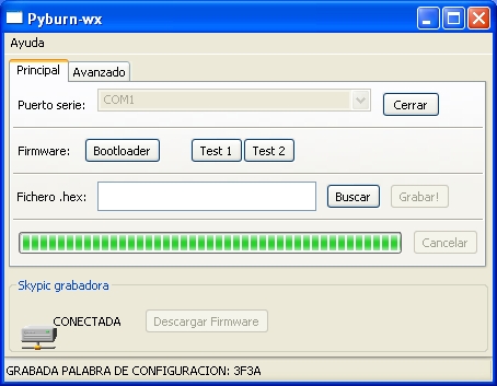 Ya hemos liberado la versión 1.0 del programa Pyburn, que permite grabar firmware en la Tarjata Skypic usando como programador otra Skypic.