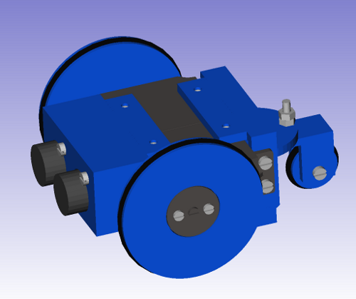 Las piezas del MiniSkybot V1.0 están diseñadas con OpenScad y se han ensamblado “virtualmente” con el programa Freecad para ver su apariencia en 3D (figura superior).
