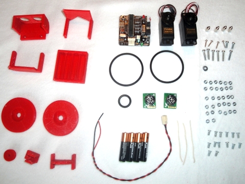 En esta foto se pueden ver todas las piezas necesarias. Se utilizan dos servos de tipo Futaba 3003 (trucados) y una tarjeta Skycube como electrónica. Las herramientas de desarrollo software son las mismas que las empleadas para el robot Skybot y los robots modulares.