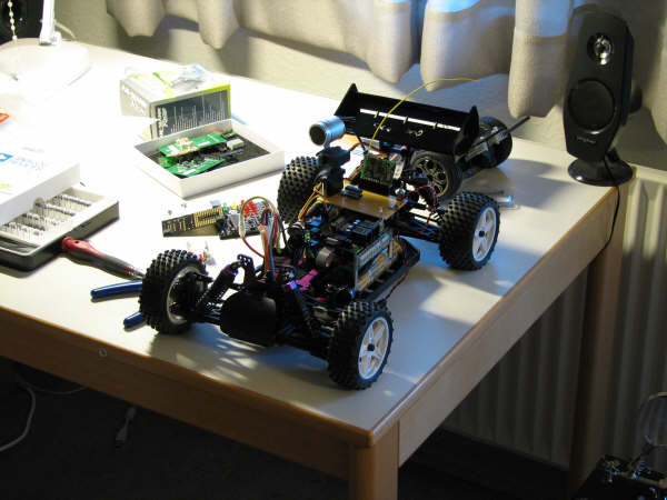 Me acaba de enviar una foto del prototipo preliminar del robot que está construyendo para su proyecto fin de carrera. Está utilizando la estructura de un coche de radio control, que me recuerda mucho a la del robot Bartolo que hicieron Carlos Venegas e Iván González en el Club de Robótica-Mecatrónica de la UAM.