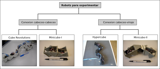 (1) Configuración dinámica de un extremo de cada módulo 0 a 90º, para transformar conexiones cabeceo-cabeceo a cabeceo-viraje. Equivale a una versatilidad en la adaptación dimensional de locomoción solo en un extremo donde sea necesario cambiar desde un modo ‘ágil’ en superficie plana hacia un modo ‘escalador’, manteniendo una mayor estabilidad en el otro extremo.