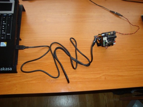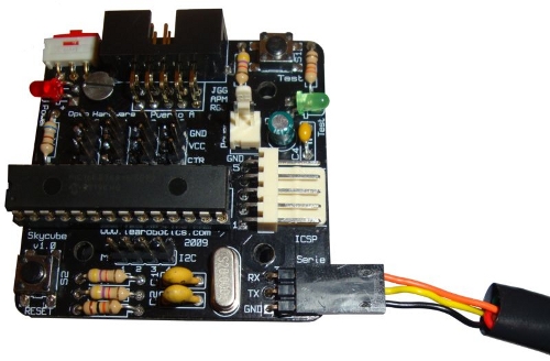 Para conectar la Skycube 1.0 al PC utilizamos el cable USB-serie de FTDI, modelo TTL-232R-5V. Es un cable que incorpora un conversor usb-serie. Por un extremo se enchufa al USB del PC y mediante un conector de 3 pines (similar al de los servos futaba) se conecta a la Skycube.