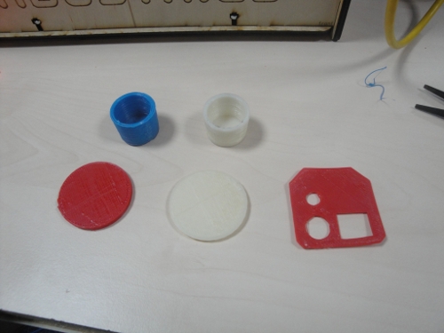 Y aquà algunas de las piezas que imprimimos: vasos de chupito, fichas de casino y una pieza diseñada por Andrés para colocarse en una cámara.