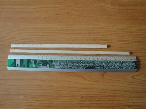 Inicialmente la estructura quedó un poco coja: las 4 patas no apoyaban a la vez en el suelo. Así que corté dos trozos de madera de 290mm y 234mm para que las distancias de todos los lados fueran iguales. La estructura mejoró mucho.