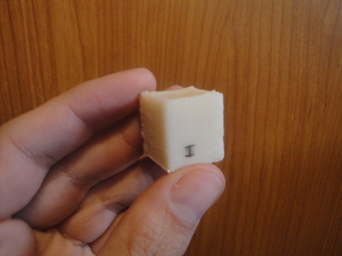Ahora toca aprender bien el Skeinforge >= 41 para hacer la calibración fina y conseguir calidades buenas. El primer cubo lo he marcado con un I para ir comparándolo con los sucesivos cubos y “medir” la variación de la calidad.