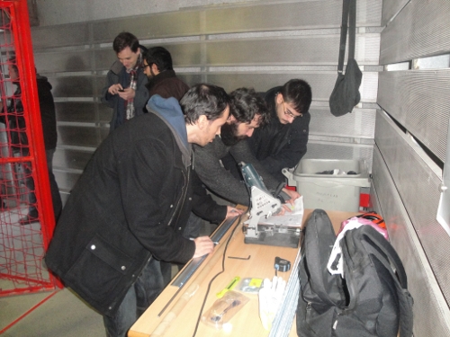 Y con esto nos despedimos. Aquí estamos los aventureros en el MediaLab, con la mesa totalmente tomada por los productos químicos y las piezas.