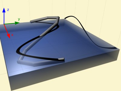 En el dibujo se muestran en negro las proyecciones de la onda 3D sobre el agua y el plano zx. Para poder ver intuitivamente qué partes de la onda están en la región z<0 y cuáles en z>0 he añadido un estanque de agua lo que además le da a este dibujo técnico un aspecto más artÃstico 🙂