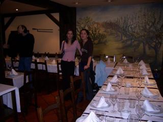 En la izquierda, nuestras dos azafatas, Teresa y Mercedes, nos muestran la mesa en la que se celebró la cena. A la derecha vemos a los organizadores: Pablo y David. "Nos vamos a poner hasta el culo de comer"
