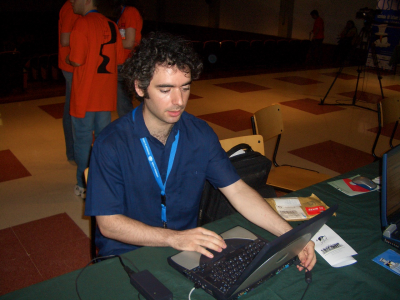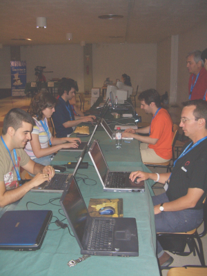 Una de las cosas que más me gustan de estos congresos es la cantidad de gente que va con sus portátiles con Linux (Foto de la izquierda). En la foto de la derecha podemos ver a Xavi hackeando con su portátil.
