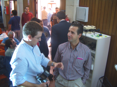 En la foto de la izquierda podemos ver a Andrés haciendo la demostración de Joshua, el robot de exploración telecontrolado desde el PC. En la derecha estoy yo haciendo una demo de Cube Revolutions.