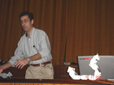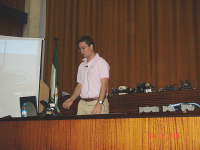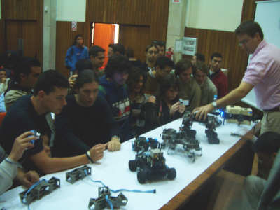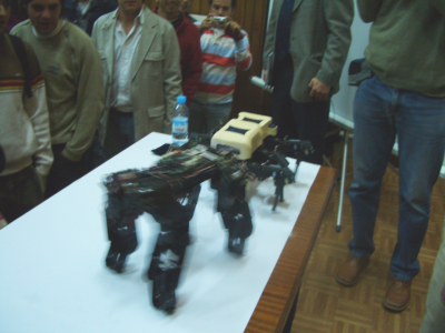 En esta charla NO se utilizaron transparencias (por eso no están publicadas aquí). Sólo se hicieron demostraciones y se mostró en la pantalla el software que se utiliza para controlar los robots. También había una cámara de vídeo externa que enfocaba en todo momento a los robots y se mostraban por la pantalla.