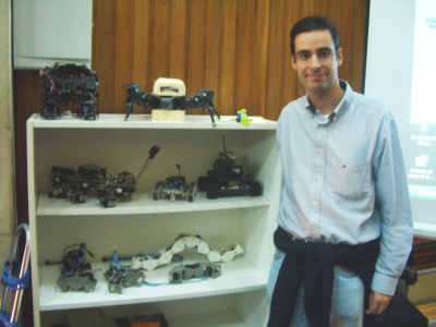 En esta charla se hacen demostraciones de diferentes tipos de robots. Se comienza por los robots con ruedas, que son los más sencillos. Primero se enseña el Skybot, el robot “hola mundo”, que es el empleado en los talleres de iniciación a la robótica. Se continúa con el Clónico, una versión del skybot que tiene una estructura mecánica mejorada. A continuación se pasa a los robots articulados, que tienen una mecánica un poco más compleja y que son más difíciles de programar. El primero es la Hormiga Benita, un robot hexápodo de 12 articulaciones, creada hace 10 años. Después se enseña a PuchoBot, un robot cuadrúpedo, que tiene en total 12 articulaciones y que se mueve de manera autónoma o se controla desde el PC. El tercero, Melanie III, es un robot hexápodo de tres grados de libertado por pata y más de 30 sensores. El siguiente tipo son los robots modulares, constituidos por la unión de módulos. La configuración más sencilla es Cube Revolutions, una cadena de módulos Y1, unidos con la misma orientación. Se mueve en línea recta mediante ondulaciones de su cuerpo. Estos módulos se pueden unir en otras configuraciones. Tres ellas se conocen con el nombre de Multicube. Se finaliza la demostración con un ejemplo de robot de exploración, Joshua, que dispone de una cámara orientable y que se controla dede el PC, permitiendo al operador telecontrolar el robot. En la demostración se proyecta en la pantalla lo que capta la cámara del robot.