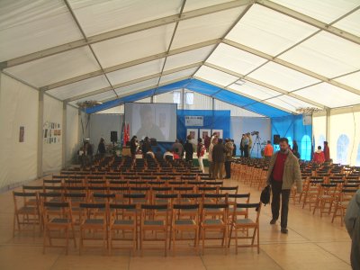 Este tipo de eventos me gustan mucho. Sin embargo, no pude acudir hasta el día siguiente. Llegué pronto. Habían montado una carpa bastante grande (foto de la izquierda), con un escenario donde se harían las pruebas y las ponencias. En el otro extremo de la carpa estaban los “boxes” donde los participantes ponían sus robots a punto.
