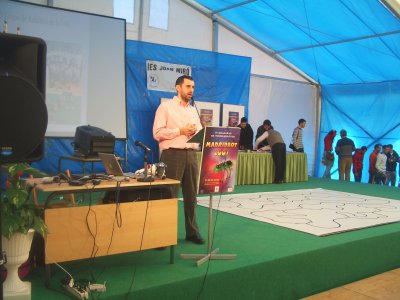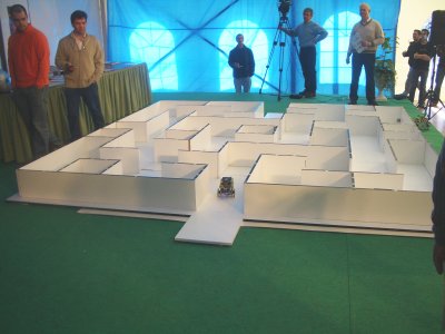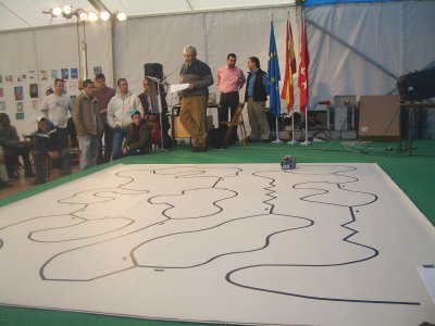 En la foto de la izquierda se puede ver el laberinto y cómo uno de los robots participantes está logrando salir. En la foto de la derecha está Jose Ignacio Bermejo, con el que había estado hace poco en las I Jornadas de ARDE en Málaga. Y es que el mundo de la robótica es un pañuelo ;-)