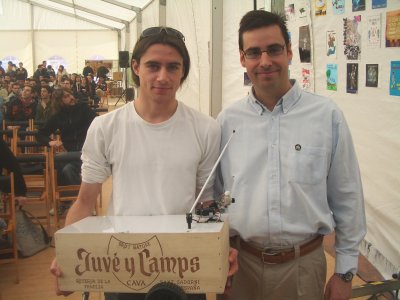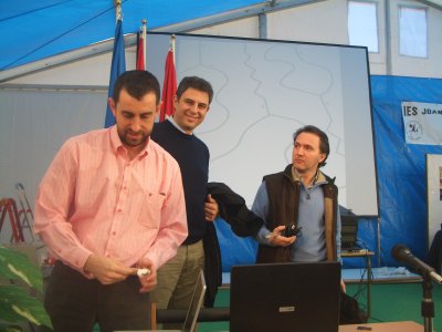 En la derecha estamos Ángel Hernández (Mif), Tupperbot y yo. El tupperbot fue el ganador en la prueba libre. ¡Es un robot cachondo! :-)