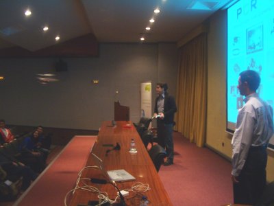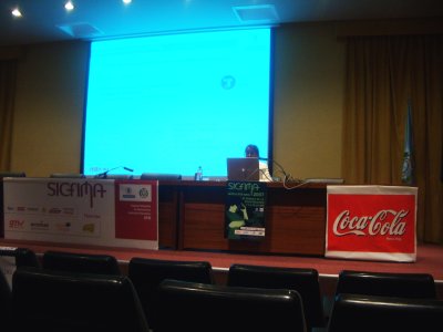 A continuación fue mi conferencia. Me centré sobre todo en las demostraciones de los diferentes robots y en mostrar en el simulador los resultados obtenidos mediante algoritmos genéticos. Pero no tengo ninguna foto de la charla :-(