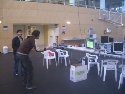 Al día siguiente por la mañana llegué pronto a la Universidad, sobre las 9. Hacía un día muy bueno (foto de la izquierda). En el pabellón apenas quedaba gente, estaban todos durmiendo después de una larga noche de frikismo (qué duro es ser friki!!!). Pero todavía quedaban algunos asistentes que estaban quemando los últimos cartuchos, como los que se ven en la foto de la derecha (sorry, no sé vuestros nombres :-( ). Estaban jugando a la wii. Esta consola yo la conocía por la televisión y los vídeos de YouTube, pero nunca la había visto en vivo y en directo. Muy amablemente me invitaron a jugar con ellos a los “bolos”. ¡¡Es increible!! Me enamoré automáticamente de la Wii... pero lo que más me gustaron fueron los mandos que iban por bluetooth. Y recordé que había leído en Menéame un artículo sobre alguien que había puesto en marcha unas librerías para poder leer la información del mando... ummm eso era muy interesante. Ya tenía proyecto friki para hacer durante la noche ;-)