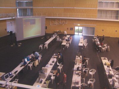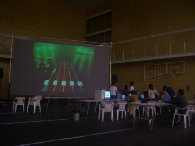 Pero el auténtico espíritu de las parties está por la noche. En la foto de la derecha se puede ver a la gente jugando al Frets on Fire en una pantalla grande y con la música sonando por los altavoces para todo el pabellón. Muy friki ;-) Esa noche no me quedé mucho tiempo. Tenía mi charla al día siguiente a las 10 y quería estar fresco. Alicia Andrés (zona lunar) me acercó al hotel. ¡Muchas gracias! ;-)