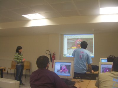 El sábado por la mañana llegamos pronto a la iParty. Yo me fuí al taller de Blender dado por Merce Galán (Megacat). Nos enseñó modelado y animación básicas con Blender, aplicadas a la creación de un logotipo animado, como el que se muestra en la foto de la izquierda.