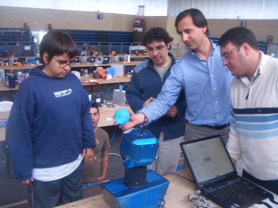 Uno de los comportamientos que están implementados en Sam es el de hacer seguimiento de un objeto azul. En la izquierda Alejandro está haciendo una demostración. En la derecha, uno de los asistentes está moviendo un servo con el mando de la wii. En esta party ha sido la primera en la que hemos mostrado esta aplicación. Realmente la aplicación se “gestó” en la iparty en Castellón, pero aquí fue la primera vez que la mostramos “oficialmente” como parte de una demostración de robótica ;-)