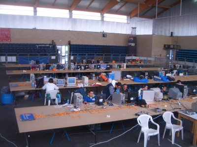 La EbroParty se organizó en el pabellón multifuncional de Bayas. En la foto de la izquierda se puede ver un ala del pabellón. Era una party pequeña, de unos 100 asistentes aproximadamente. En la derecha podemos ver a Jose Luis y Ricardo atendiendo las explicaciones de Alejandro. Está diseñando el cuerpo de Sam y quería la consultar la opinión de un experto como Jose Luis.