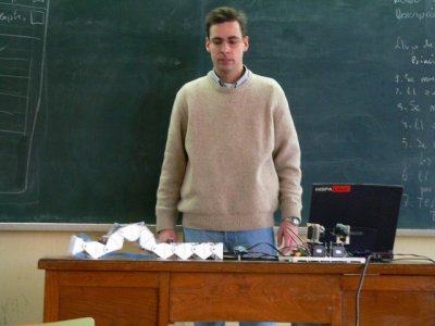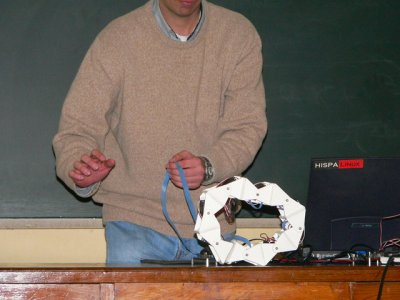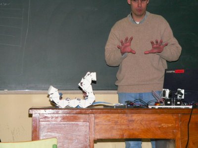 Como siempre, en estas charlas hago muchas demostraciones. A la gente le gusta ver cosas moverse, más que escuchar un rollo teórico :-). En la foto de la derecha se ve a Cube Revolutions en posición de “cobra”.