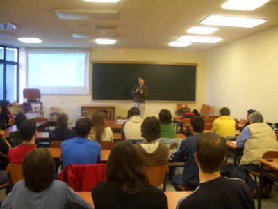 Víctor Martín, Vicedecano de la Facultad de Informática de la UPSAM, fue el organizador de las sesiones. En la foto inferior está conversando con algunos alumnos, a la espera del resto de los asistentes.