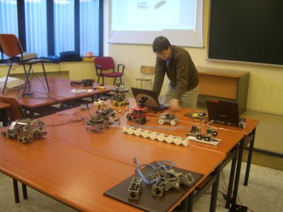 Como es habitual en este tipo de charlas, Andrés Prieto-Moreno yo (Juan González) llegamos con media hora de antelación para ir montando el “despliegue” de robots. En la foto de la izquierda se puede ver a Andrés junto con todos los robots: PuchoBot, Benita, Los ojos, el clónico, Cube Revolutions, Muticube, Observer, Skybot y ese rojo que está en frente de Andrés que todavía no ha sido bautizado. A la derecha se ve el despliegue desde otro ángulo y a algunos asistentes que iban llegando. Para hacer las demos y controlar todos los robots utilizamos dos ordenadores portátiles, con Linux instalado por supuesto :-)