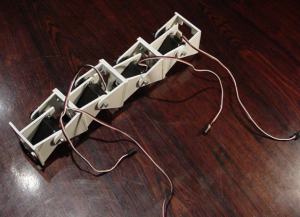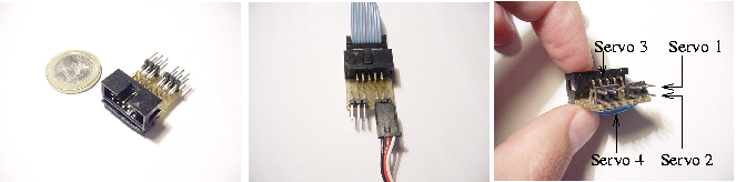 Para organizar los cables y que sea más fácil la conexión entre los servos y la electrónica, se ha construido la placa PCT-servos, que por un lado tiene un conector acodado para cable de bus y por el otro tiene unos pines para la conexión de los 4 servos. Es una placa pasiva y no se ha realizado ningún PCB.