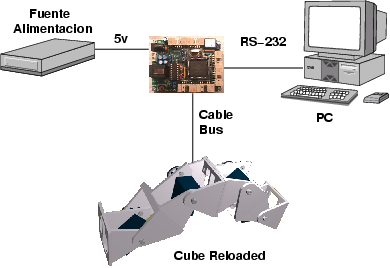 Cube Reloaded se puede controlar usando una tarjeta CT6811, conectada a un PC a través del puerto serie (RS-232). La alimentación tanto para la electrónica como para los servos se toma de una fuente de alimentación externa (5v). Mediante un cable de bus se conecta la CT6811 con la PCT-SERVOS, situada en el interior de uno de los módulos de Cube Reloaded. El esquema se puede ver aquí: