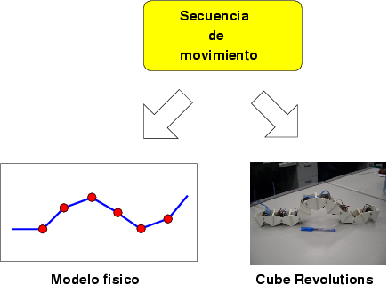 Dada una secuencia de movimiento, bien se puede enviar a Cube revolutions para que se mueva, utilizando el programa cube-play o el Star-servos8, o bien se puede enviar al gusano virtual con el modelo físico implementando, utilizando el programa cube-virtual-play.