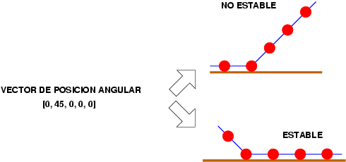 En la siguiente figura se ilustra con un ejemplo para un gusano de 5 articulaciones. Partiendo de un estado interno de [0, 45, 0, 0, 0], que quiere decir que el servo 1 está en su estado inicial (0 grados), el siguiente rotado 45 grados y todos los demás en sus posiciones iniciales, se muestran dos gusanos virtuales con ese mismo estado interno. Uno de ellos está en una situación intestable: si lo colocásemos sobre una superficie horizontal no permanecería en esa posición, sino que se “caería” hacia la derecha. El otro gusano sí que está en una situación estable.