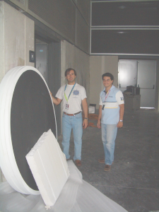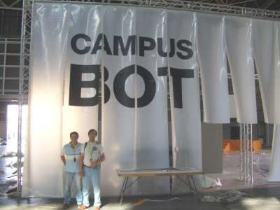 Por la tarde volvimos a la feria a continuar con los preparativos de CampusBot. Había todavía muchas cosas por hacer... y tan poco tiempo!!!! La campus estaba a punto de empezar!!!! En la foto de la izquierda se puede ver el estado del “CUBO”. Todavía estaba sin terminar... En la derecha están Alejandro y Jose junto a los tatamis del concurso de Sumo.