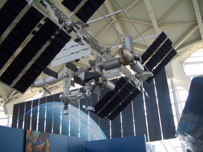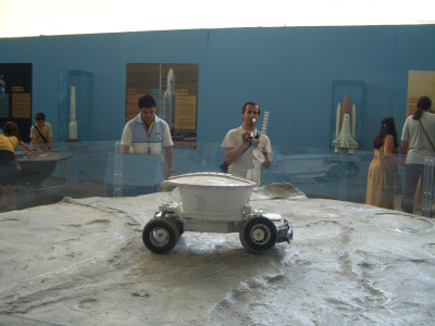 También llamaba la atención la réplica de la estación espacial internacional que está colgada del techo (izquierda). En la foto de la derecha Jose y Alejandro están en el área dedicada al espacio, observando un vehículo lunar. Se ve que están totalmente enganchados a esto de la robótica ;-)