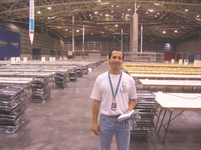 Llegamos directamente a la Feria de Valencia (aunque nos costó un montón de vueltas encontrarla). Pudimos ver asombrados lo que iba a ser la campus: dos pabellones enormes, llenos de mesas y sillas, donde la gente se sentaría con sus ordenadores (foto de la izquierda). Nunca antes habíamos estado en una Campus Party. Yo personalmente me quedé alucinado.