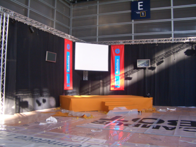 Después del “sock” inicial, empezamos a centrarnos en el área de CampusBot. Había que ver cómo estaban las cosas. Lo primero que nos fijamos fue en el “CUBO”, una zona situada al final de CampusBot donde se impartirían las conferencias, concursos y el taller (foto de la derecha). Aquí es donde empezaron los problemas: faltaba otra pantalla, el escenario era mucho más pequeño de lo que inicialmente se había especificado, no había rampa para que los robots pudiesen subir al escenario, tampoco estaban las mesas que se utilizarían en el taller, ni las tomas de red, las mesas de los asistentes no disponían de regletas...
