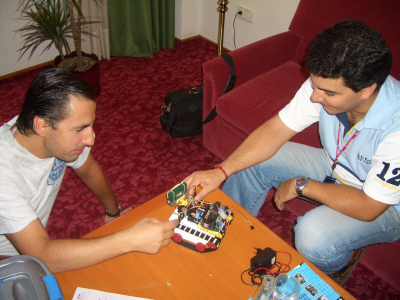 Después de cenar nos fuimos Jose, Alejandro y yo, a la habitación de Alejandro, donde estuvimos hablando relajadamente sobre robótica. Ya sin tensiones, charlamos sobre nuestras experiencias en el mundo de la robótica. Jose nos enseñó su robot Siko.