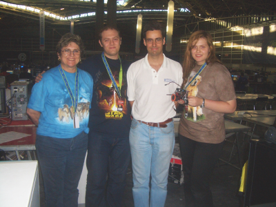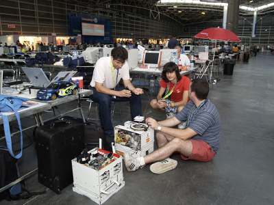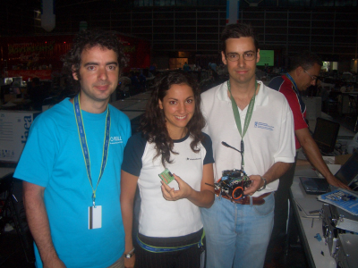En la foto de la izquierda, Julio Pastor, Javier Rodríguez y Óscar González, están preparando los robots que iban a enseñar en su charla del día siguiente, sobre la competición de Eurobot.