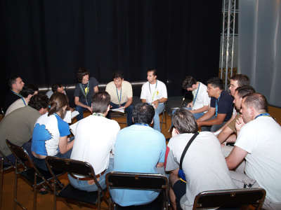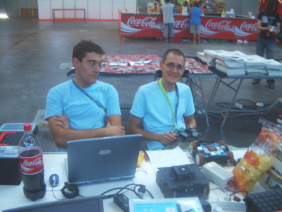 El viernes, también, empezaron a llegar algunos de los concursantes del SUMO, sin duda la prueba reina. En la foto de la derecha vemos a Raúl Martín y David Yánez, que estaban trabajando en sus robots de sumo: La Bestia y Abobinable. A David Yáñez lo conocí en la semana de la ciencia Andaluza que se celebró en la Universidad de Cádiz.