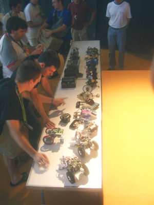 ... y después de comer... comenzaron las pruebas de clasificación para el concurso de rastreadores. En la foto de la derecha están todos los robots que se presentaron, incluidos los de sumo.