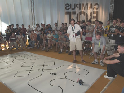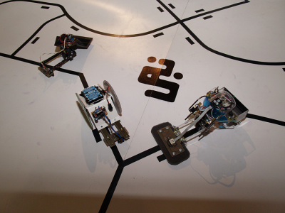 El concurso de rastreadores de CampusBot era novedoso. Los robots no sólo tenían que recorrer el circuito, sino que competían de dos en dos y se podían dar casos como el de la foto de la derecha: una colisión entre robots.