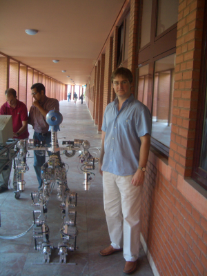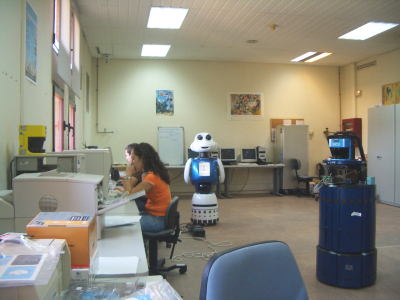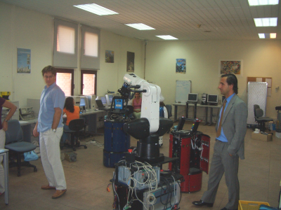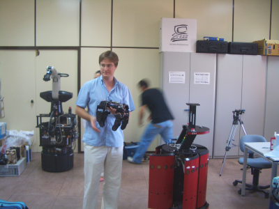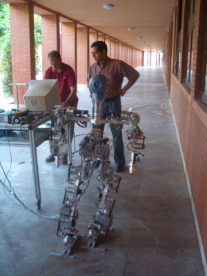 Andrés Prieto-Moreno y yo (Juan González) quedamos a las 16h con Alejandro Alonso para irnos al campus de Leganes de la Universidad Carlos III. Allí nos recibió D. Miguel Ángel Salichs, del Robotics Lab. En la foto de la derecha, están Alejando y Miguel Ángel. En la foto de la izquierda Andrés y Alejandro están en uno de los laboratorios del Robotics Lab, donde estaban los robots zipi, zape, Maggie y un brazo robot industrial.