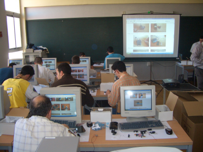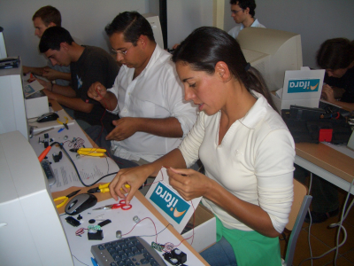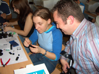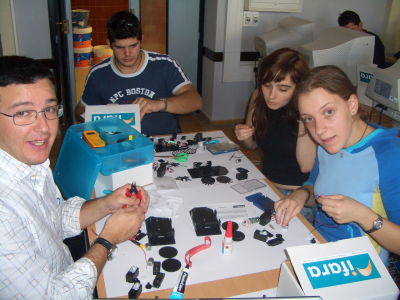 En los talleres los protagonistas son los asistentes, que tiene que “cacharrear” y montarse su robot. En la primera sesión montan la estructura básica y trucan los servos. Tienen que manejar herramientas y utilizar un soldador. La documentación está puesta en la web y cada grupo tiene en su puesto un ordenador donde va siguiendo las instrucciones.