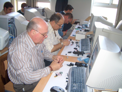 En la foto de la derecha vemos a Arturo Morgado junto a otros asistentes montando su robot. Esto de la robótica no tiene edad :-)