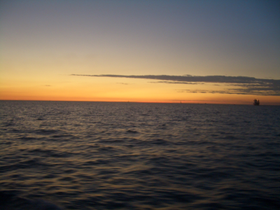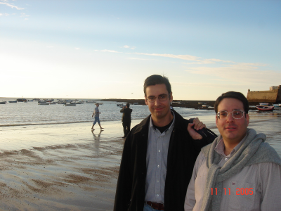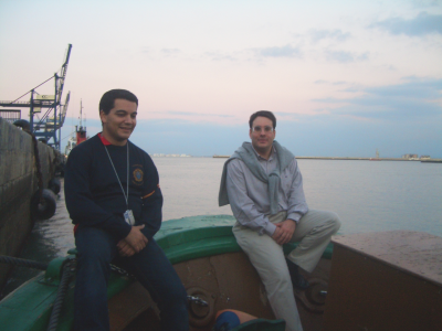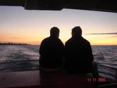 La travesía duro unos 45 minutos y durante el camino pudimos contemplar una espectacular puesta de sol (foto de la izquierda). En la foto de la derecha estamos Andrés y yo, en la parte trasera del barco, con Cádiz al fondo, hablando tranquilamente sobre cómo había salido todo.