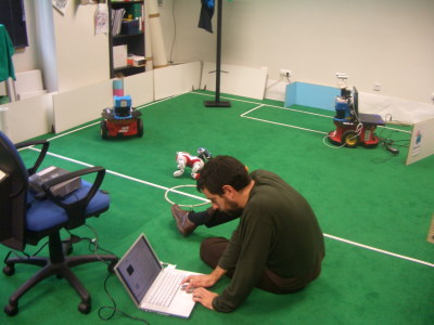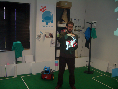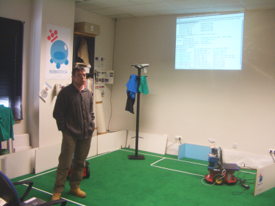 Nada más entrar a uno de los laboratorios, lo que más llama la atención es un campo de fútbol que cubre todo el suelo. Lo utilizan para probar su equipo de fútbol de robots Aibos. Vicente Matellán nos estuvo enseñando el funcionamiento de estos robots y todo el software que han desarrollado para el control de su equipo de fútbol. En la derecha vemos a Vicente Matellán sentado en el suelo haciendo una demo de los robots. Esto es lo que tiene la robótica, que hay que ser todo terreno ;-)