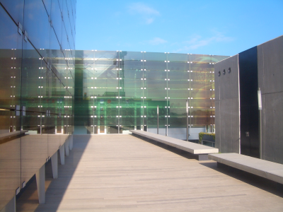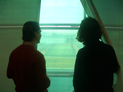 Nos enseñó los edificios de la Ciudad Politécnica de la Innovación, donde está el ITI (foto de la izquierda). Tienen un aspecto muy futurista y las fachadas de cristal tienen unas serigrafías translúcidas que le dan un aspecto muy friki :-) En la derecha están Alejandro y Juan Carlos dentro del edificio. Se pueden ver los '0' y '1' grabados en el cristal y un cierto color “verde matrix” que hace que todo sea más friki ;-)