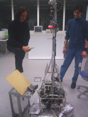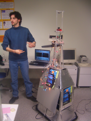 Luego, Juan Carlos no enseñó algunos de los proyectos que desarrollan en el ITI. En la izquirda vemos a uno de los robots, junto a Martín Perís. Como estábamos en diciembre lo habían decorado con luces :-) En la derecha el robot está conectado a una especie de “vagina” para recargar sus baterías. El robot es muy friki. Tiene un “pene” por donde se recarga :-D