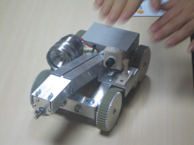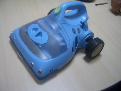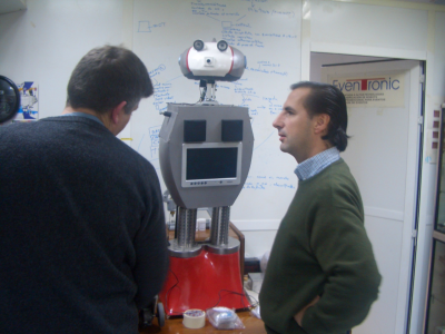 Por último, Javier nos enseñó uno de los múltiples robots no comerciales que tiene, como esta aspiradora “tuneada” (foto de la izquierda) a la que le ha añadido sensores de ultrasonidos y unas ruedas :-) Javier Asensi es una de esas personas creativas y geniales, además de un auténtico loco de la robótica. A todo lo que ve le pone ruedas :-)