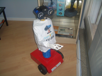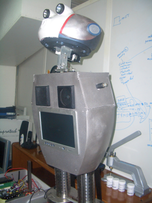 Están trabajando en la construcción de un robot de protocolo de mayor tamaño que Kiko circuito. Dispone de un monitor y unos altavoces en el pecho para mostrar información multimedia. En la foto de la izquierda Javier está explicando a Alejandro el funcionamiento del robot. En la foto de la derecha se puede ver el robot con más detalle. Javier nos estuvo contando los “secretos” de cómo lo había construido y puedo asegurar que es genial!!!